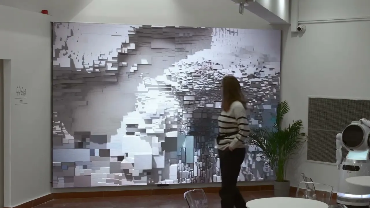 The dynamic relief is actually a mesh particle system which is based on the recursive subdivision algorithm. The guests are tracked with a depth camera, and the subdivisions become more frequent and magnetic where a human silhouette is detected.