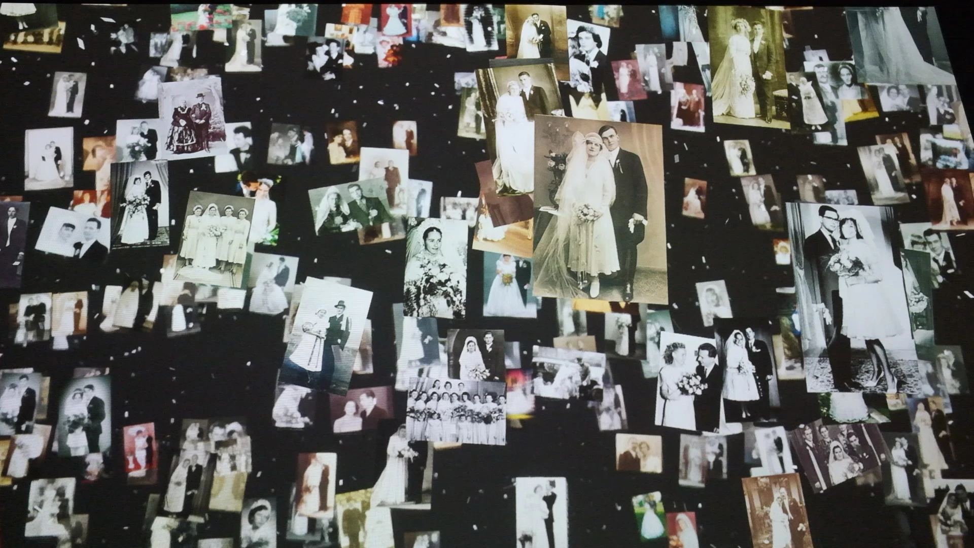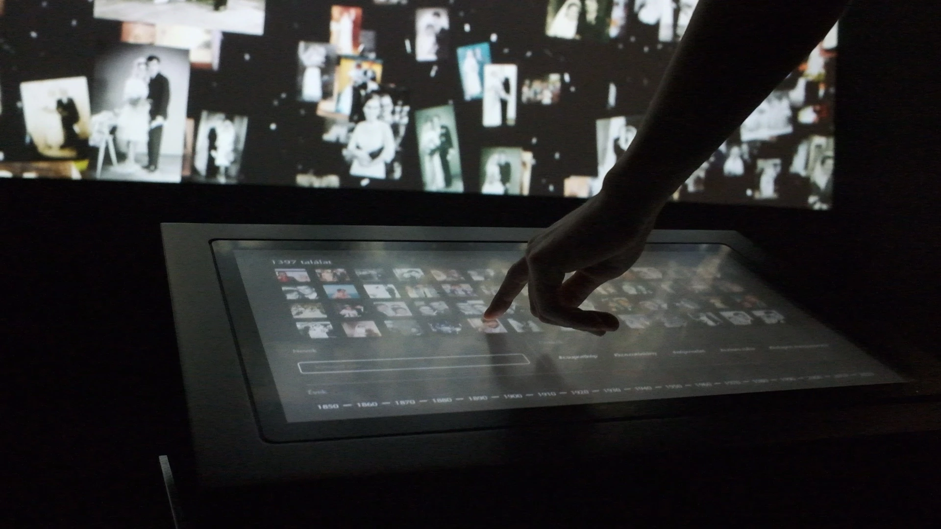 Within the exhibition space, visitors could browse through the above mentioned wedding archive in an enhanced, interactive way. Photos were fetched from a large database that is serving the original web archive collection. A custom UI allowed guests to filter images by year, highlighted features of the weddings, etc. My task was to communicate with this interface and display the selected images, highlighting the transitions with animations while also displaying information on a large LED screen.