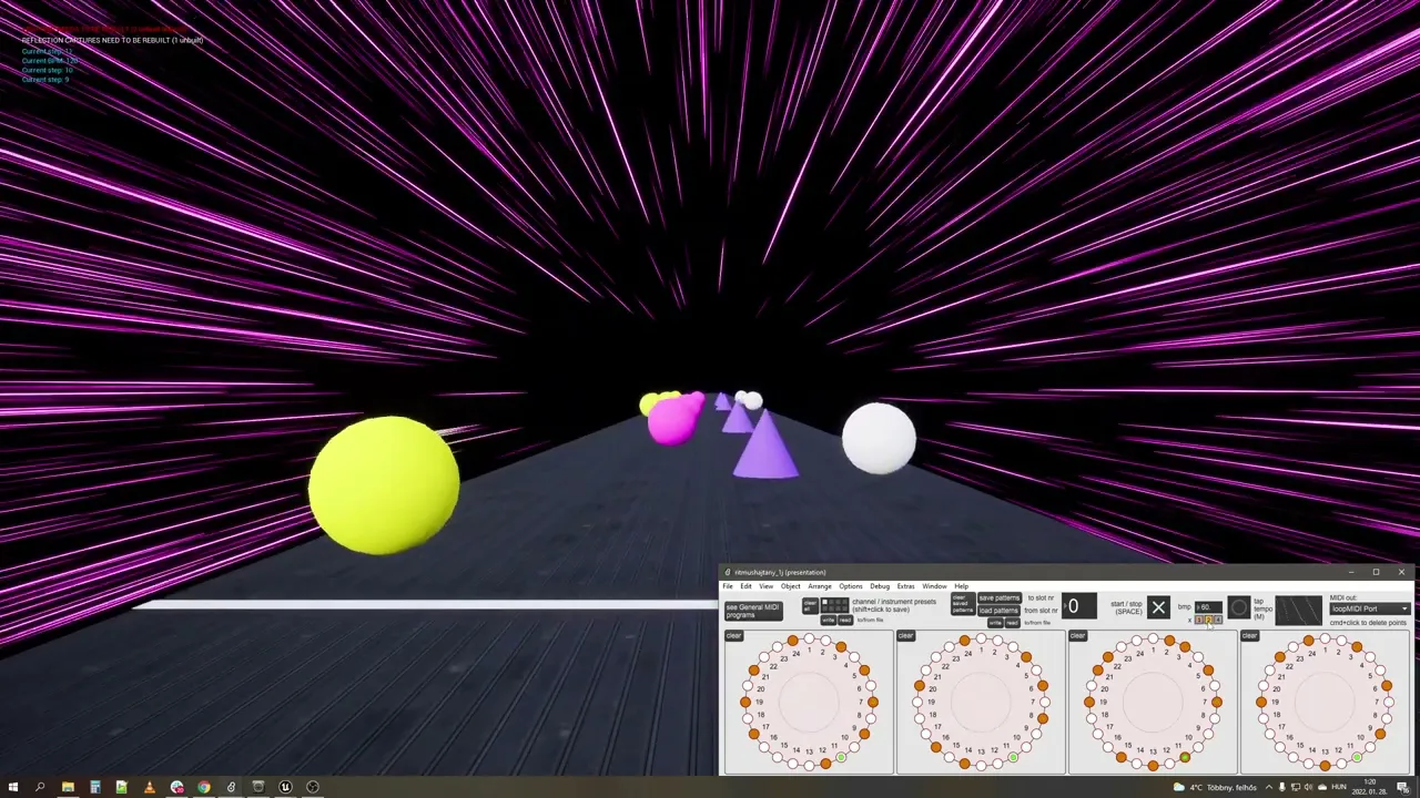 The different instruments were represented by simple geometric shapes in the development stage: they light up when a MIDI message is received. These shapes move along the same spline, synchronized to the incoming tempo.
